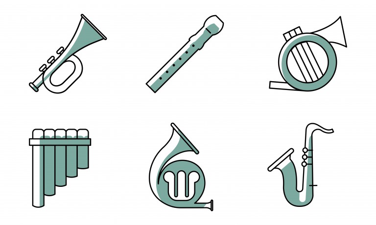وکتور طراحی خطی لوازم موسیقی، وکتور طراحی لوازم موسیقی، وکتور ابزار موسیقی، وکتور شیپور، وکتور فلوت، وکتور شیپور، وکتور ساز هورن، ساز توبا،ساز پن فلوت،