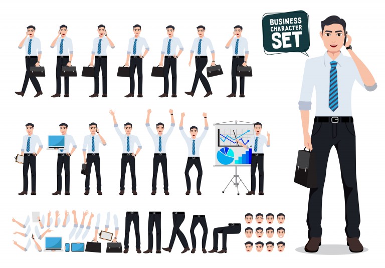 وکتور مجموعه شخصیت‌های مختلف مرد در کسب و کار ، وکتور مرد در حال صحبت کردن با تلفن همراه، وکتور مرد در حالت های بدنی مختلف ، وکتور کاراکتر انیمیشن، وکتور کاراکتر مختص انیمیشن ، وکتور کاراکتر با دست و پا های مختلف حرکتی، شخصیت کارتونی مرد ، شخصیت کارتونی مرد در حال کار کردن،