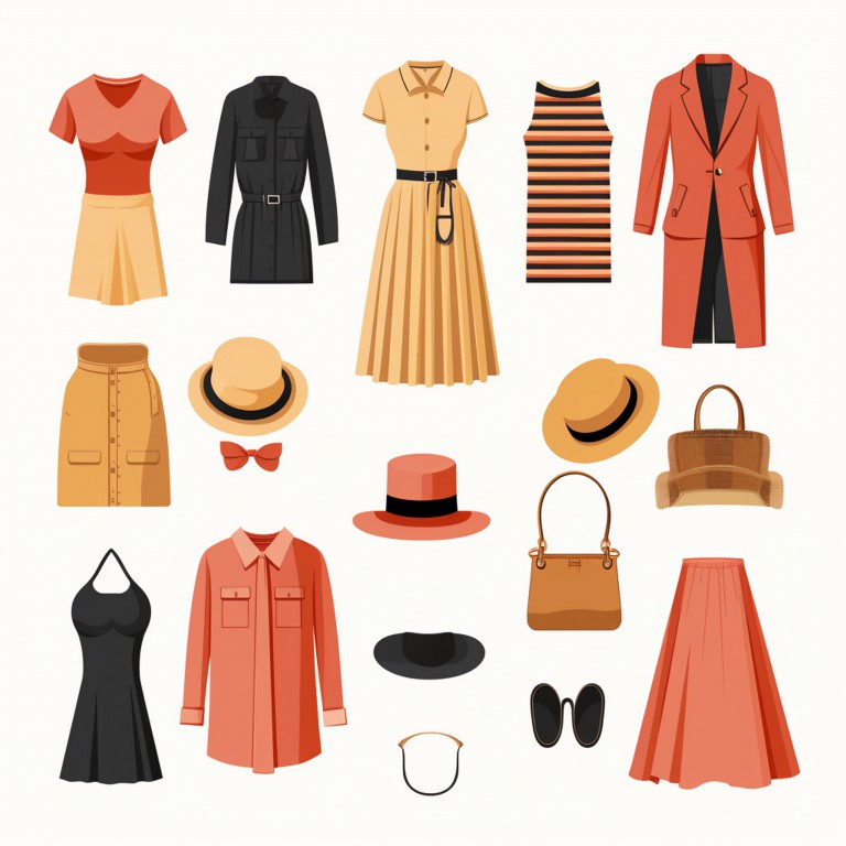 وکتور ست لباس زنانه همراه با کلاه های مختلف، وکتور دامن، وکتور کلاه ، وکتور کیف های مختلف ، وکتور بلوز و دامن، وکتور پیراهن دخترانه، وکتور پیراهن قهوه ای، پیراهن قرمز ،